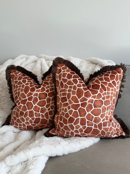 Rust Orange Giraffe Print Cushion with Fringe Trim