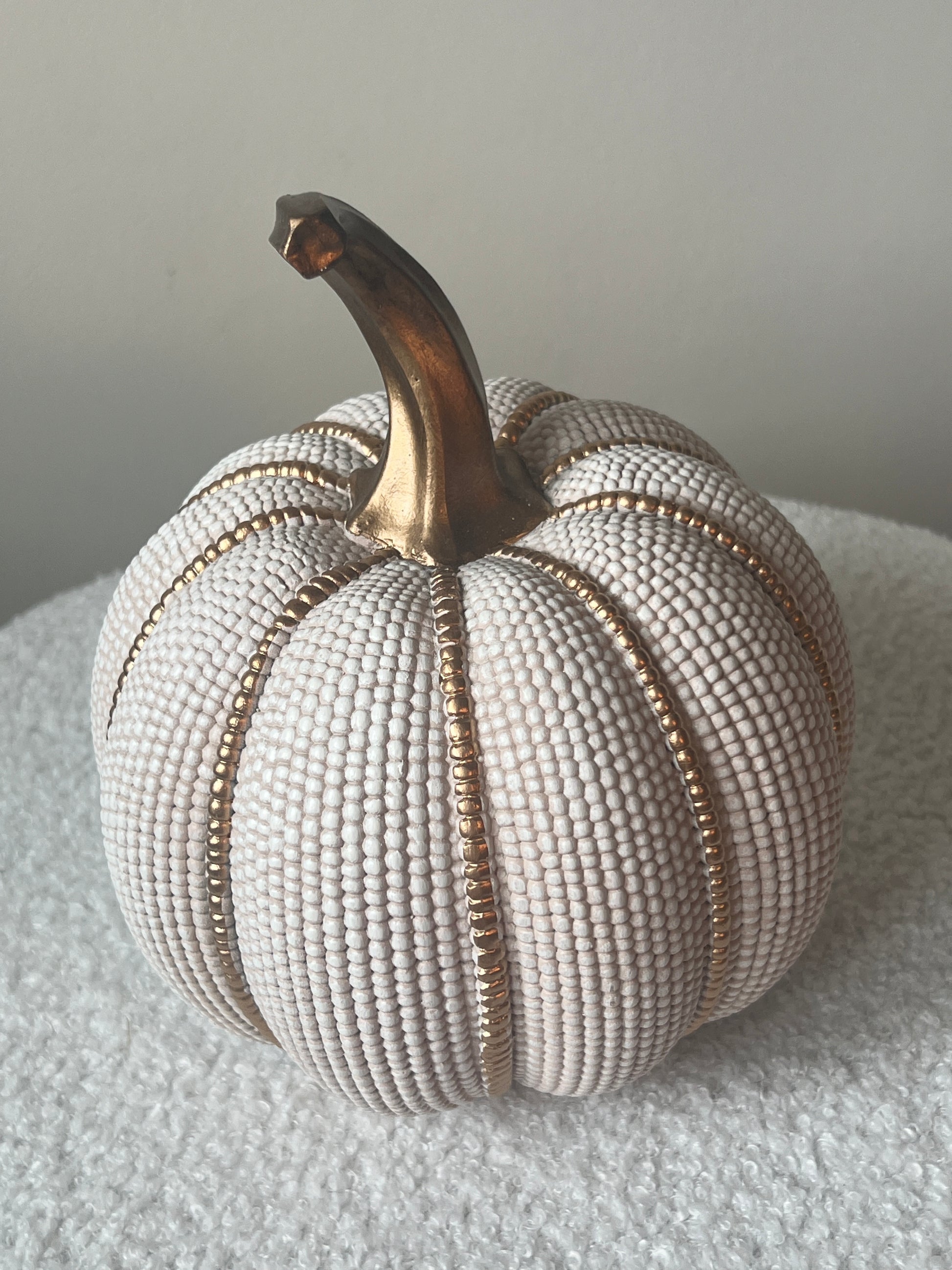 Expertly crafted, this small white and gold beaded pumpkin is the perfect addition to your fall decor. With its intricate beaded design and elegant colour combination, it adds a touch of sophistication to any space.