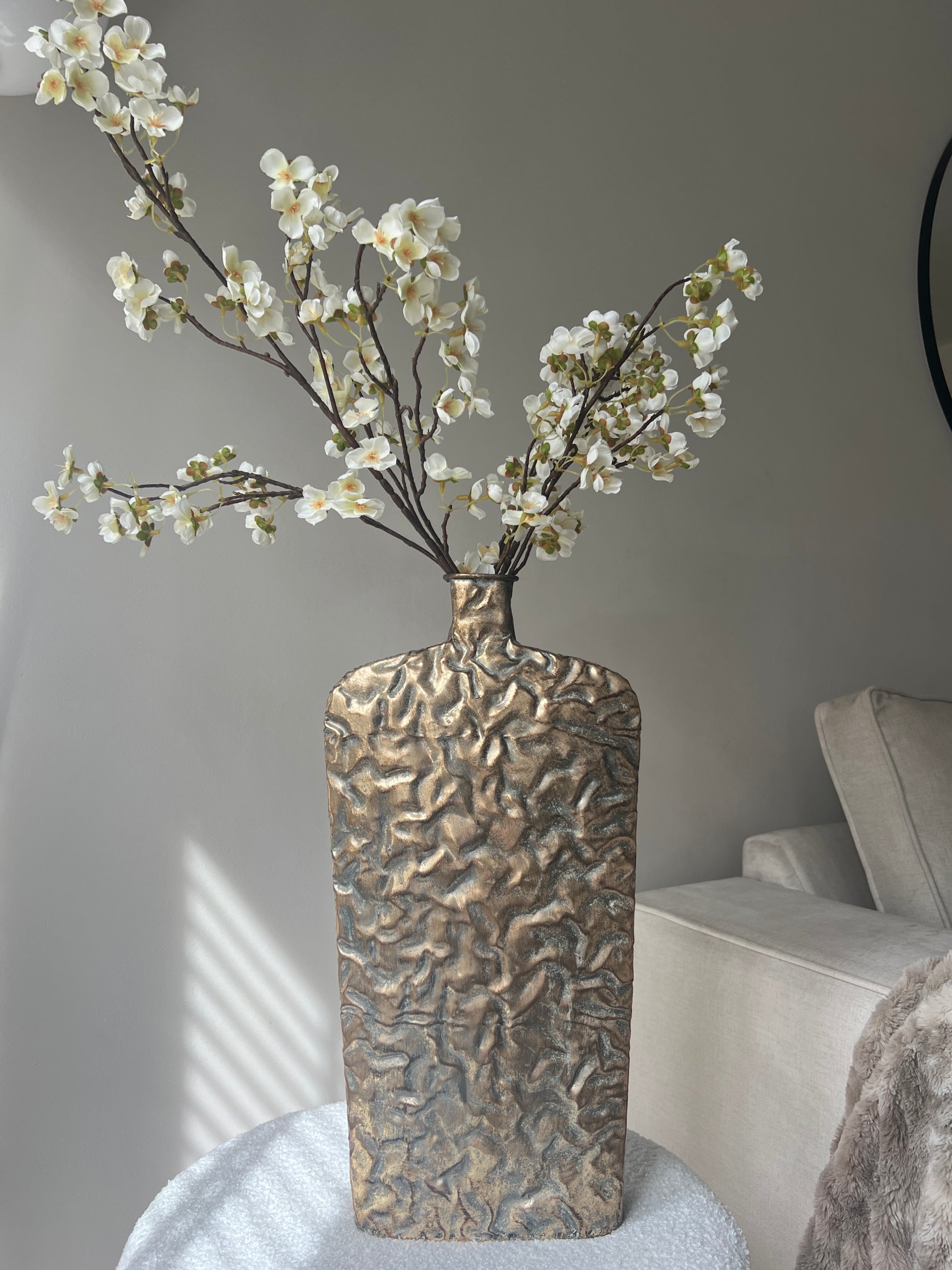 Introduce a touch of luxury to your home decor with our gold hammered vase. This tall vase features a stunning gold hammered finish for an elegant and sophisticated look.