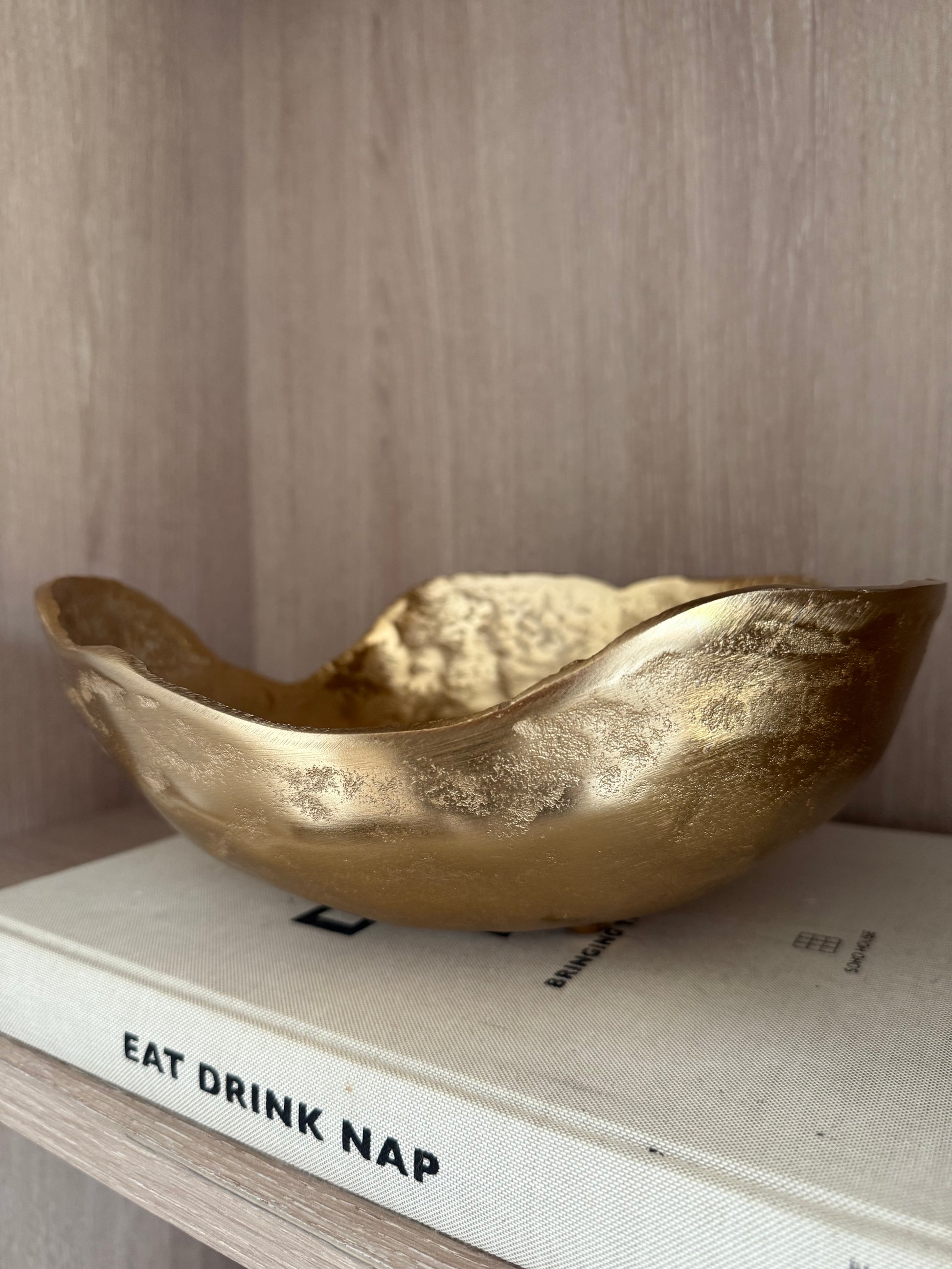This striking bowl features a beautifully textured hammered finish and an organic, flowing rim that adds character and elegance to any space. Its light gold tone brings warmth and luxury, making it a versatile statement piece for both modern and classic interiors. Measuring 28 x 11.5 cm, the Hazal bowl is perfect for displaying on a dining table, console, or coffee table, styled empty as a sculptural accent or filled with decorative objects.