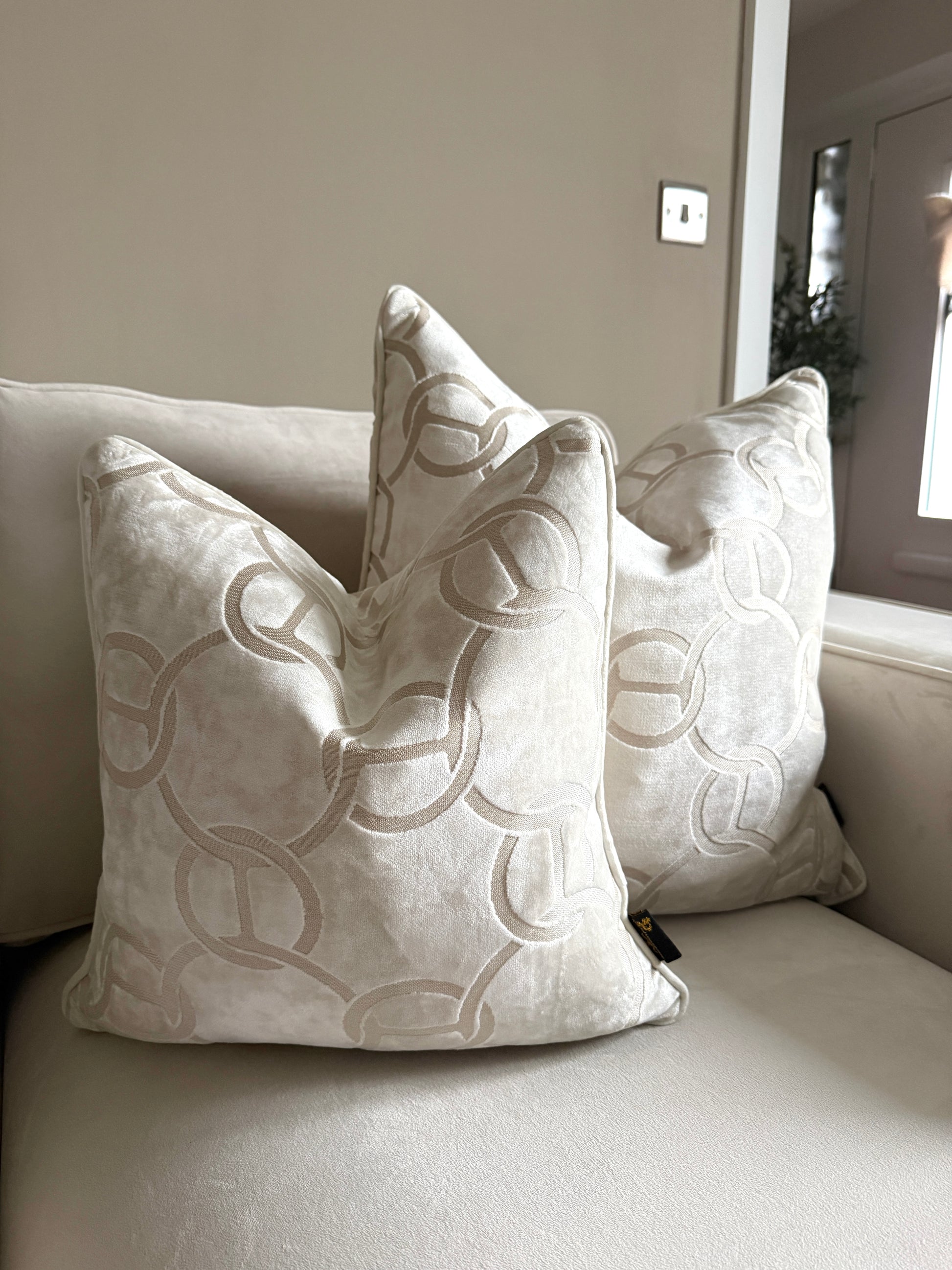 Elevate your living space with the Hookup Ivory Cushion by Paul Moneypenny, a sophisticated accent piece designed to bring understated luxury to any interior. Crafted in a soft ivory cut velvet, this cushion features an elegant interlocking chain pattern that adds depth, texture, and a contemporary edge while remaining timeless and versatile.