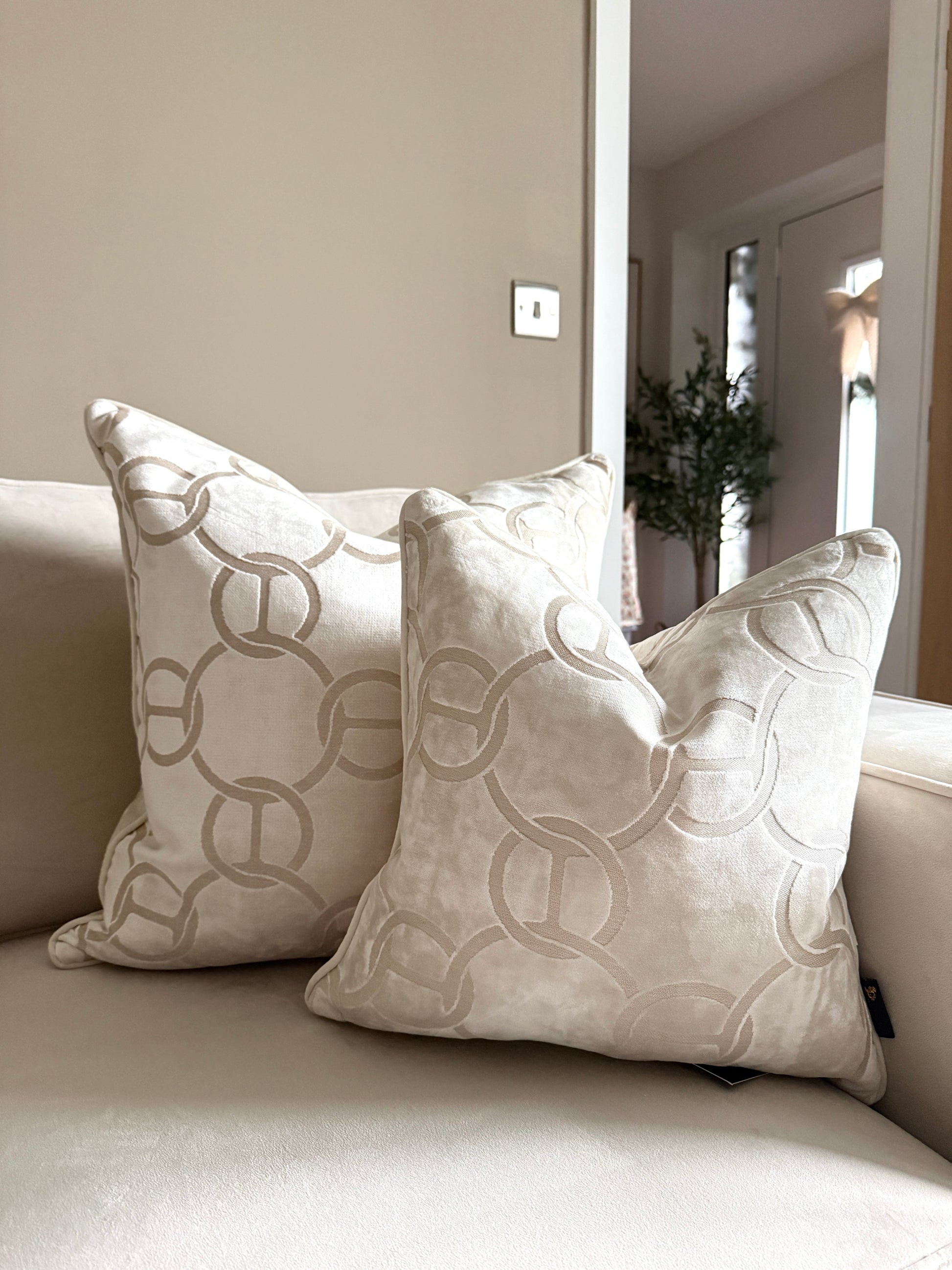 Elevate your living space with the Hookup Ivory Large Cushion by Paul Moneypenny, a sophisticated accent piece designed to bring understated luxury to any interior. Crafted in a soft ivory cut velvet, this cushion features an elegant interlocking chain pattern that adds depth, texture, and a contemporary edge while remaining timeless and versatile.