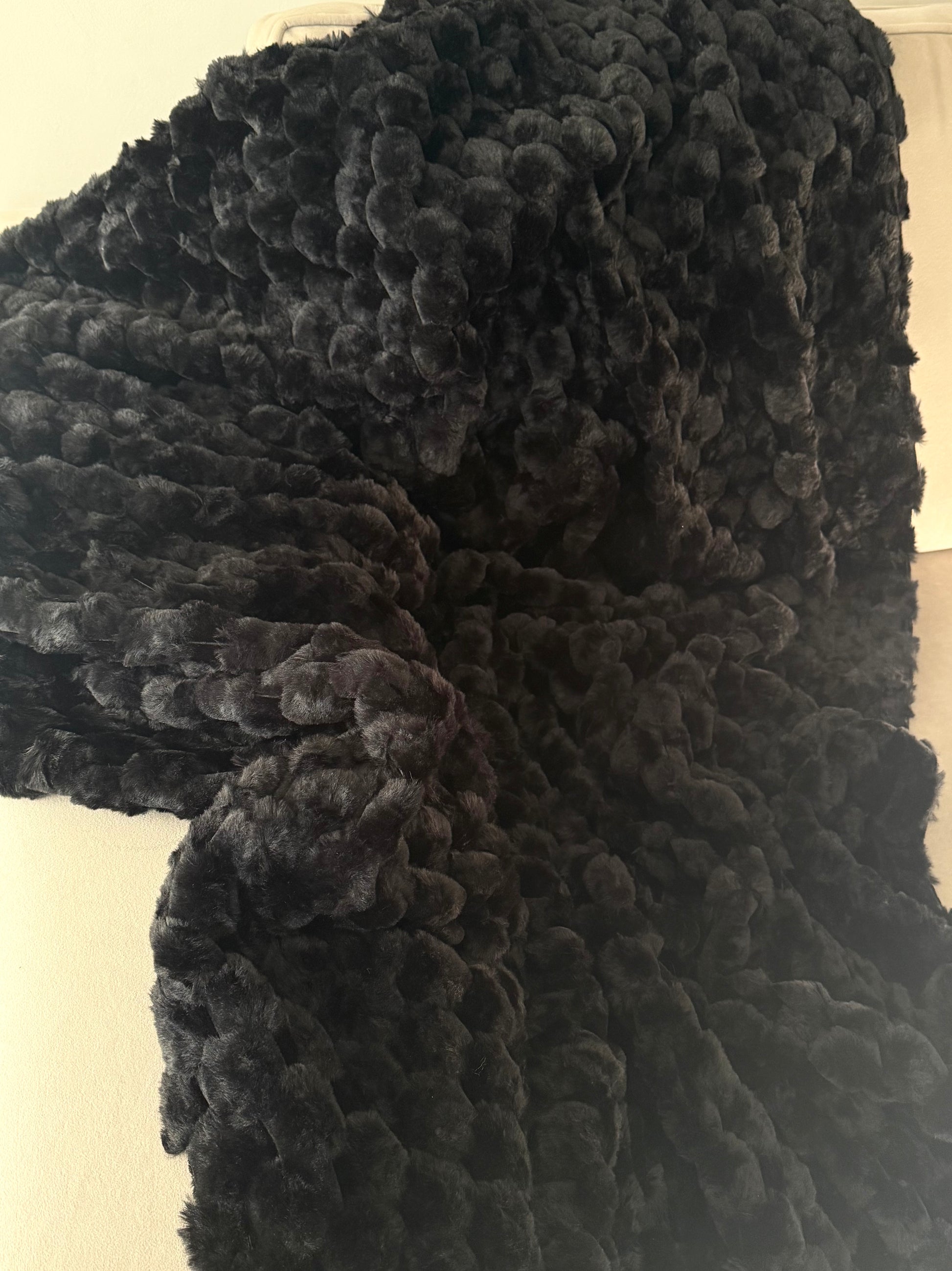 Introducing the Koochikoo black faux fur throw, by Paul Moneypenny, a luxurious addition to any living space. Its sculpted design in faux rabbit fur adds a touch of elegance and comfort to your home. With its soft and cosy feel, this throw is the perfect companion for chilly nights.