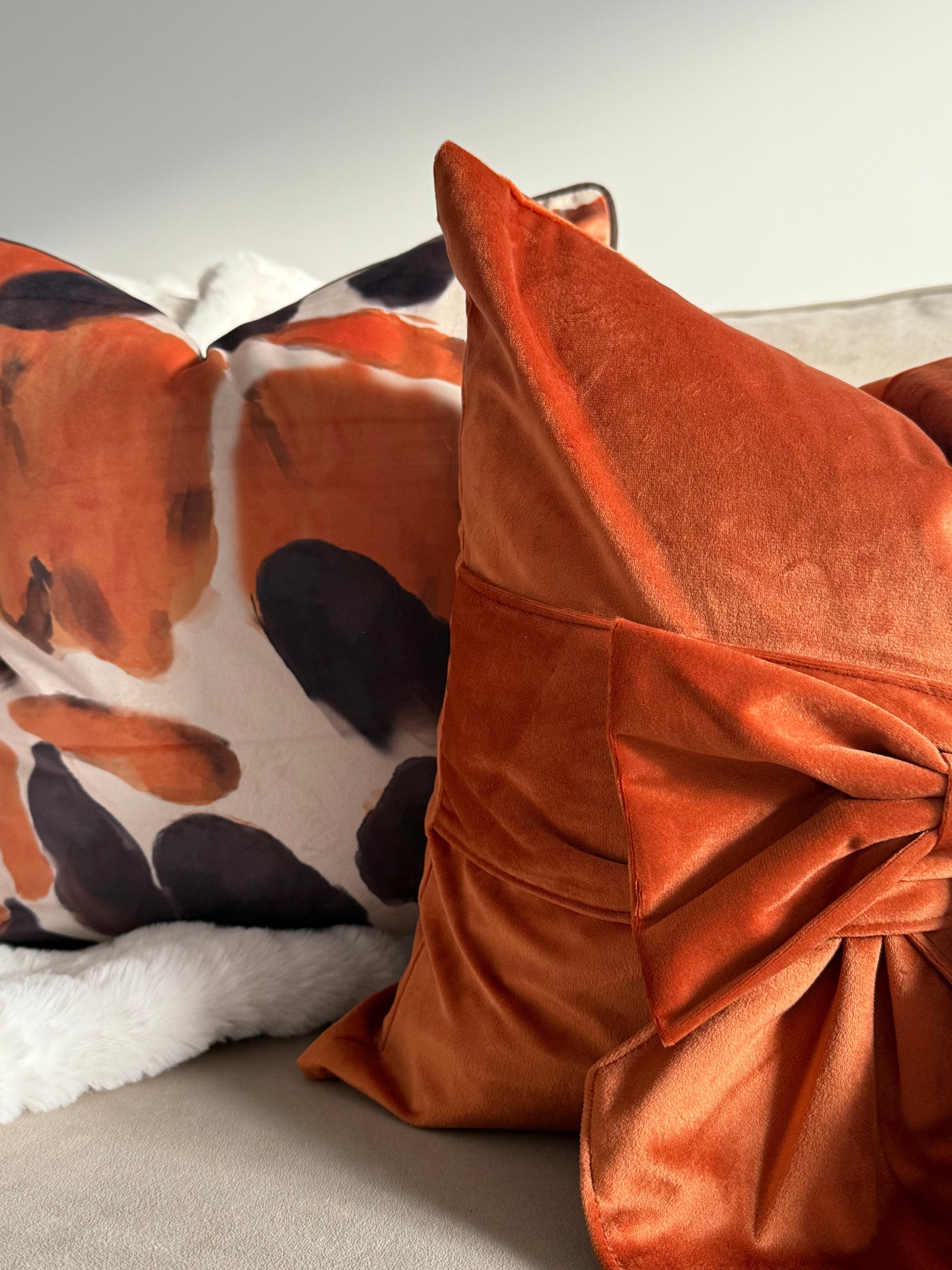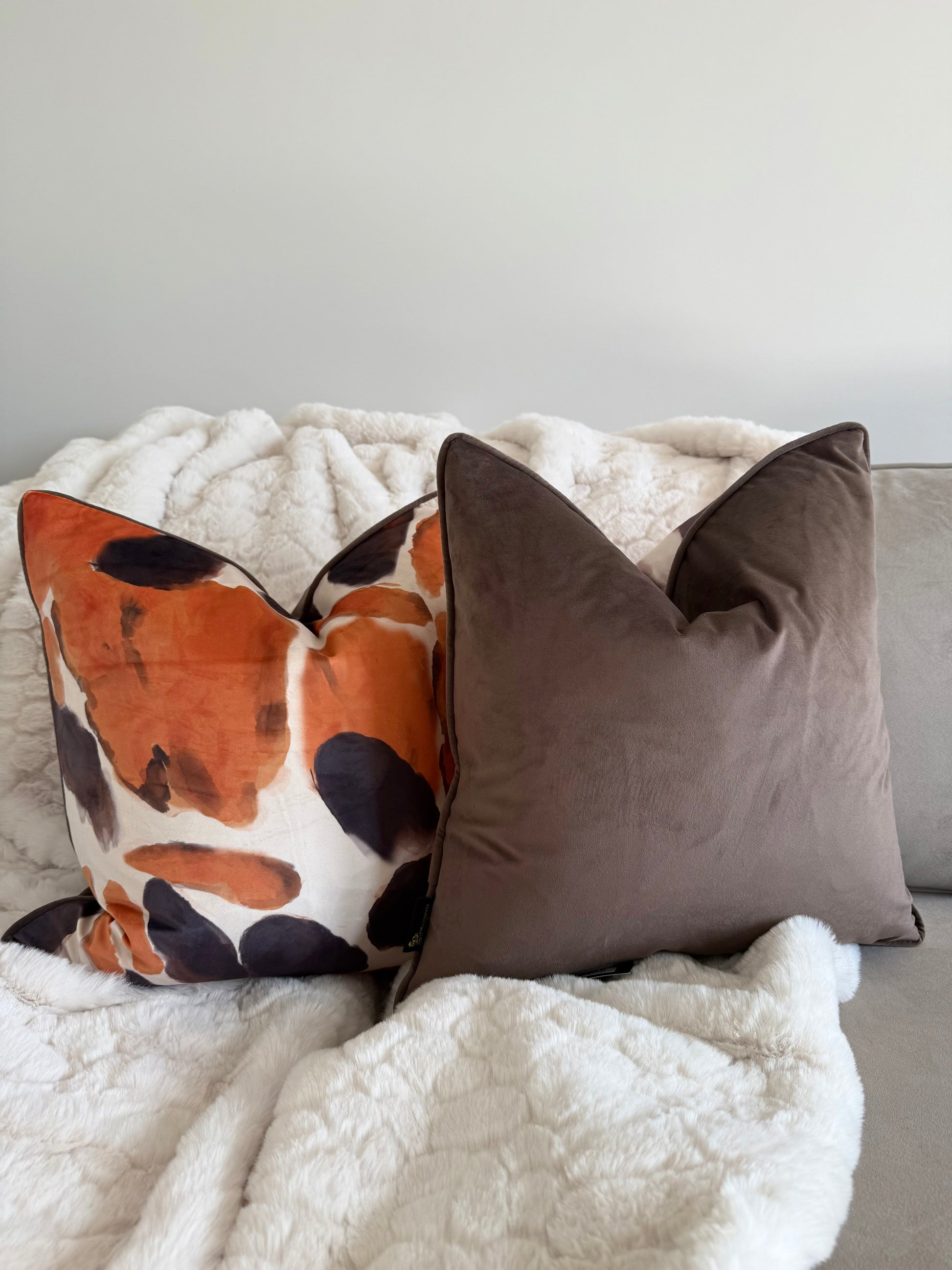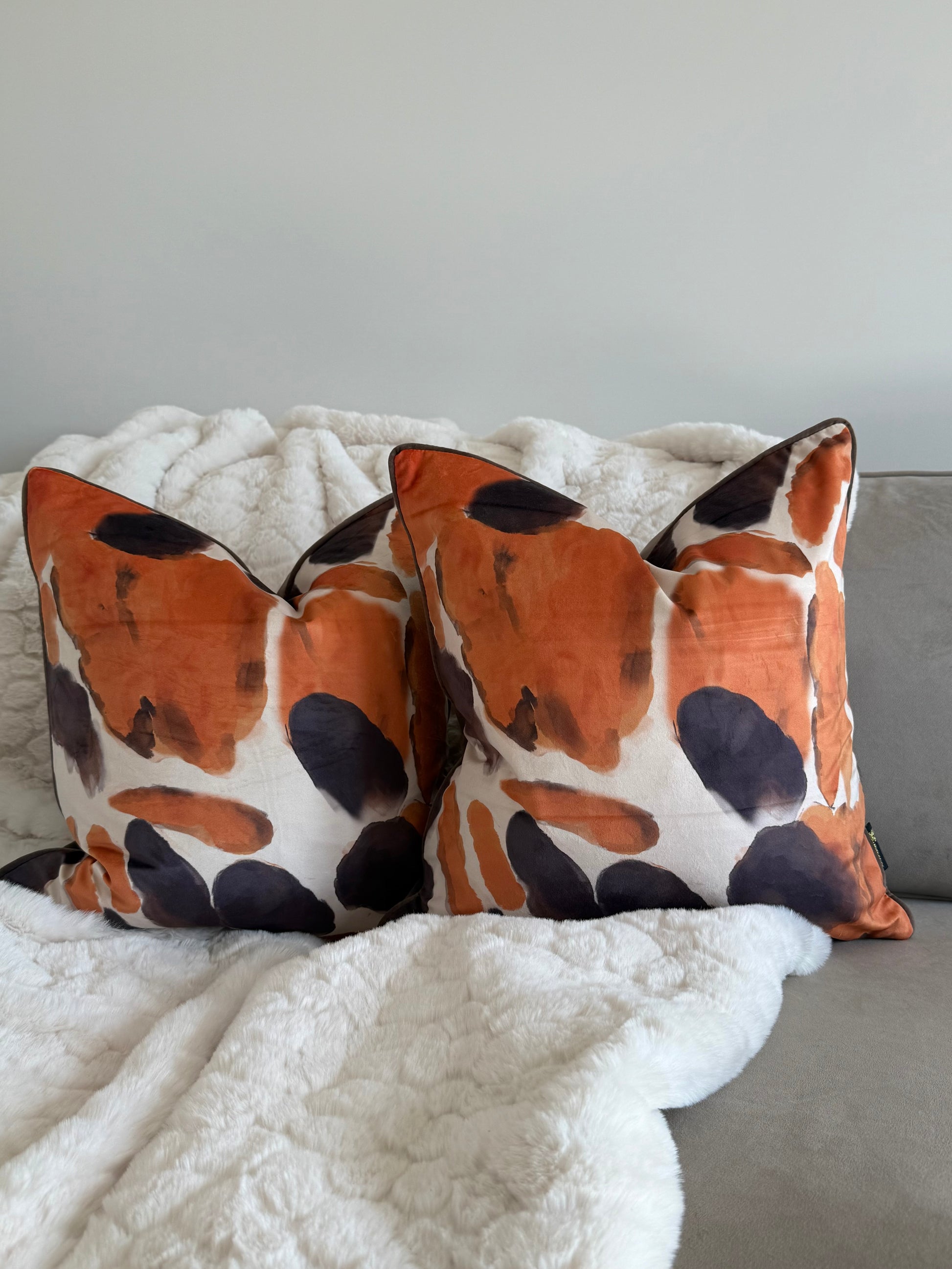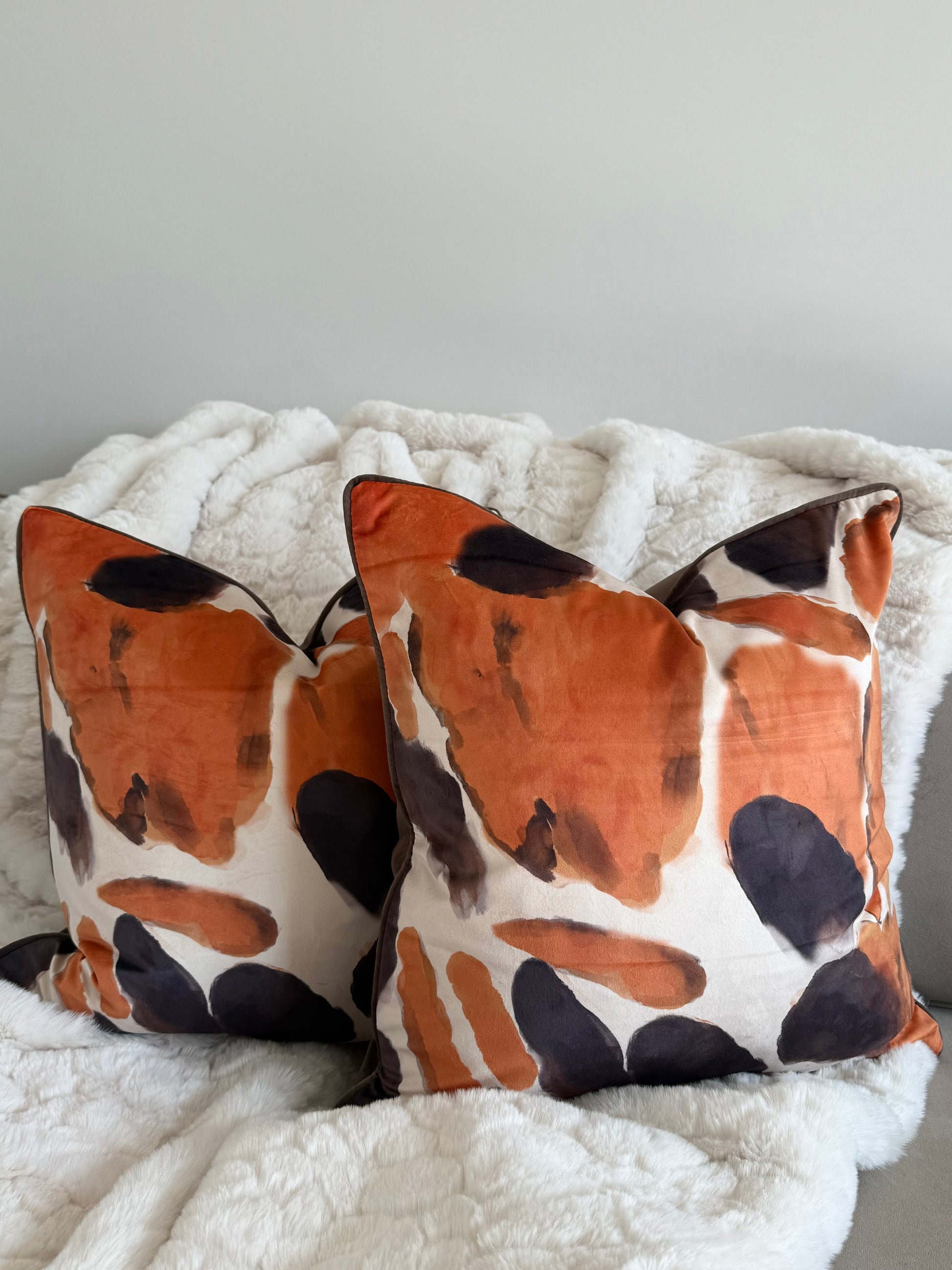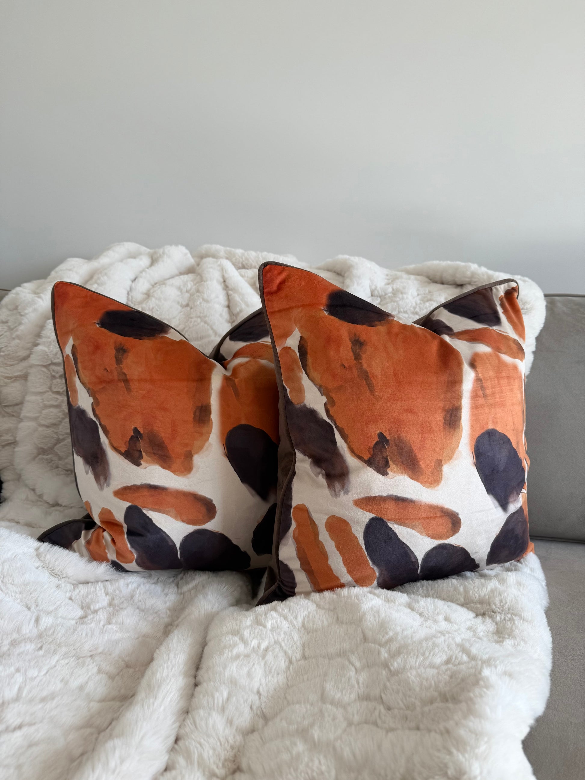 Bring bold colour and contemporary flair to your living space with the Orange You Glad Cushion, designed by Paul Moneypenny. Featuring a striking abstract design in rich chocolate and vibrant orange tones, this cushion adds instant personality to any room. The reverse side offers a smooth plain velvet finish for a versatile look that can be styled both ways.