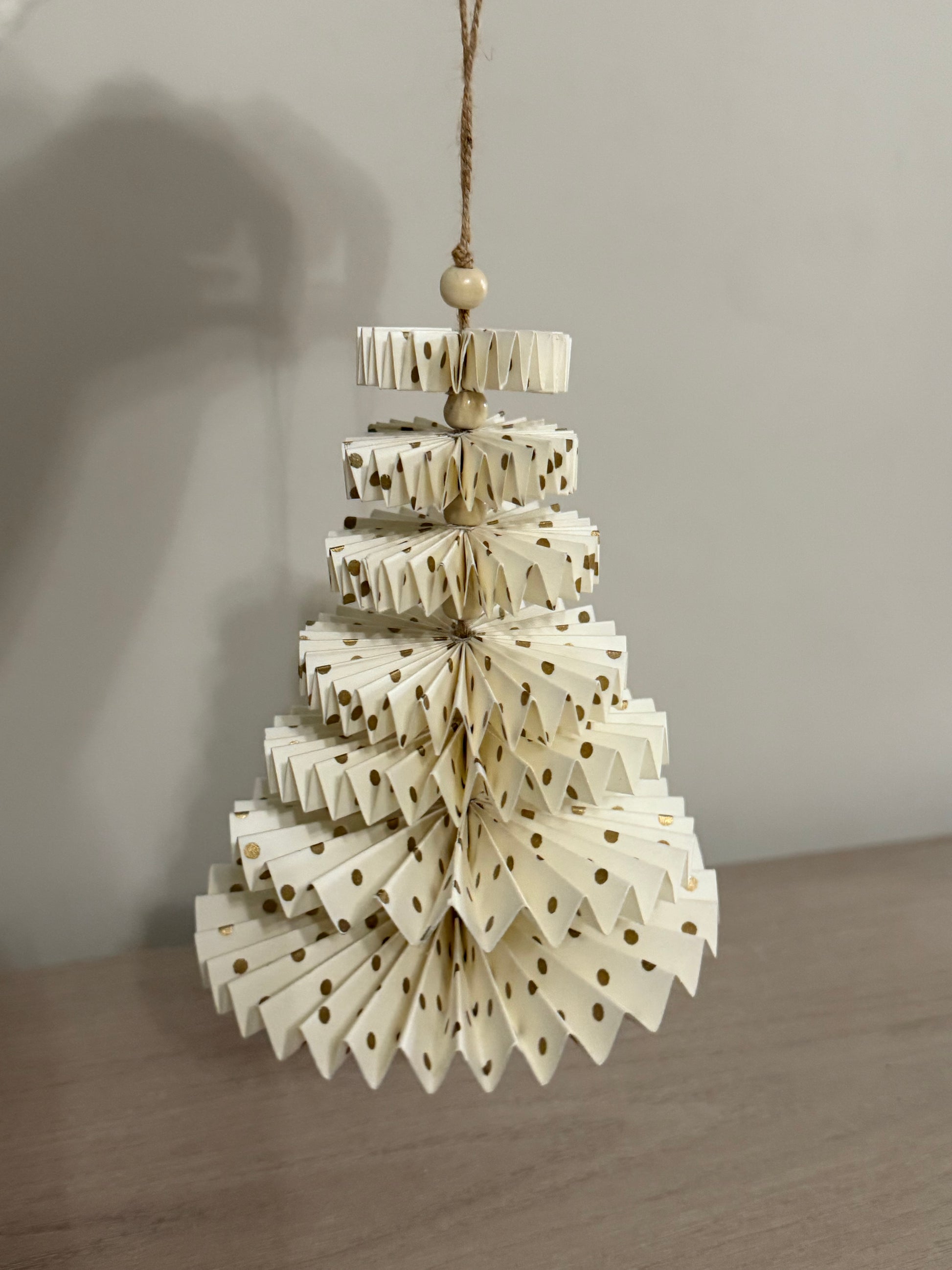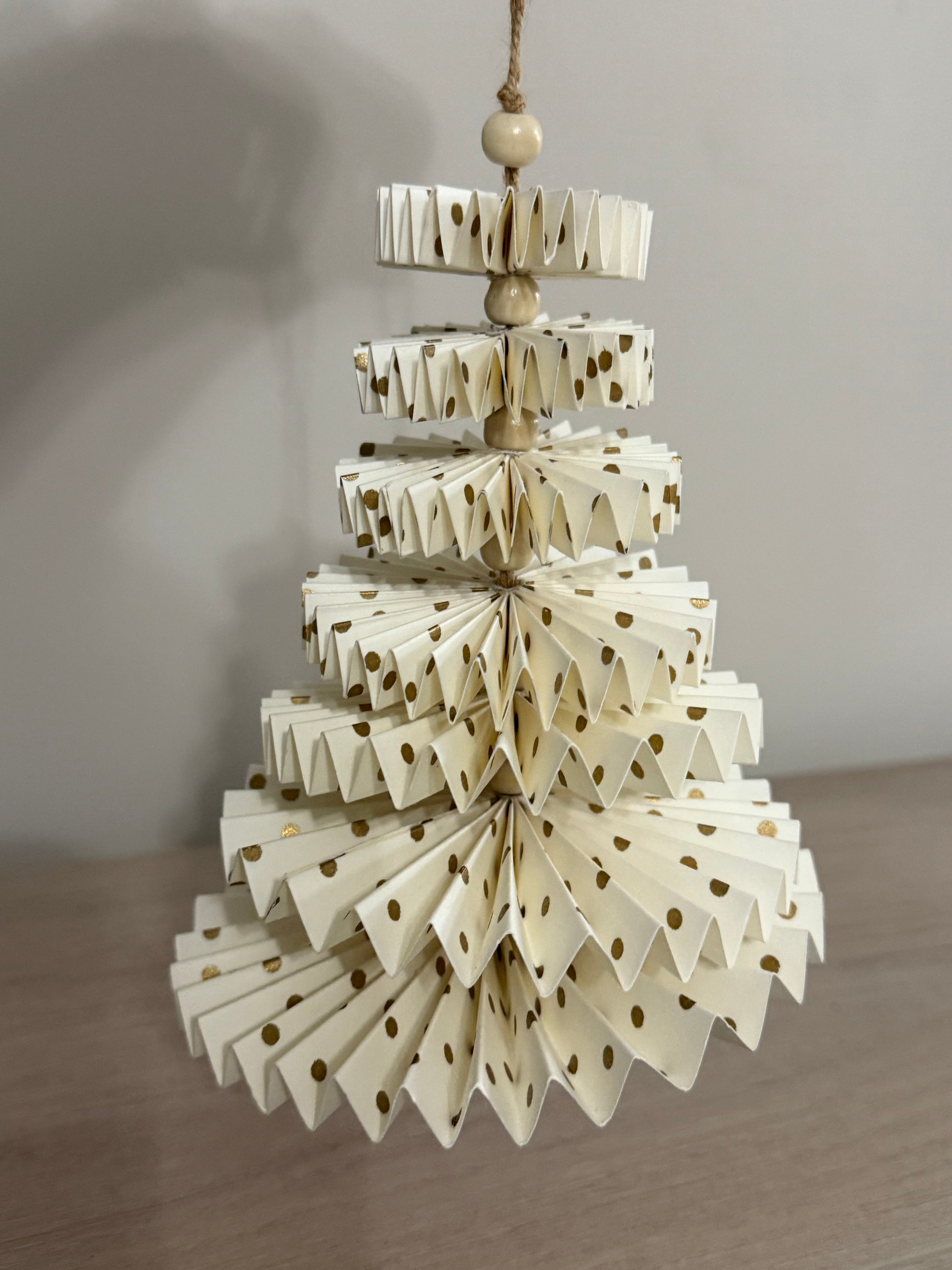 Elevate your Christmas decor with this Paper Fan Hanging Tree Ornament in white and gold. Made from high-quality honeycomb paper, this elegant hanging decoration features a delicate gold and white spotted pattern, adding a touch of sophistication to any tree or mantle. A must-have for a stylish and festive home.