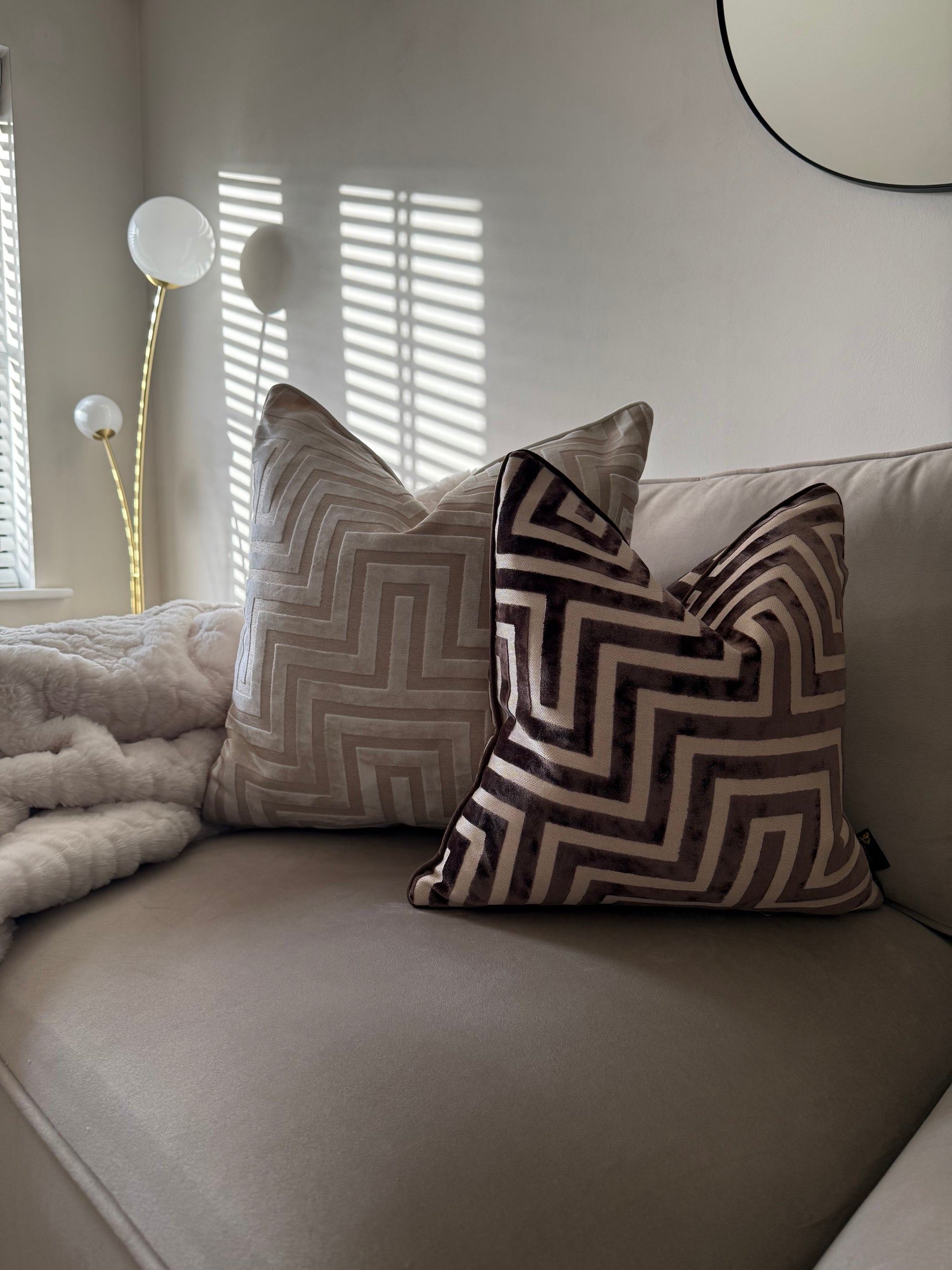Introducing the Amazing chocolate cushion. Featuring a one-of-a-kind maze cut velvet design, in a on trend chocolate fabric, designed by renowned interior designer Paul Moneypenny, this cushion exudes style and sophistication, elevating any room it graces. Make a statement with this stunning cushion.