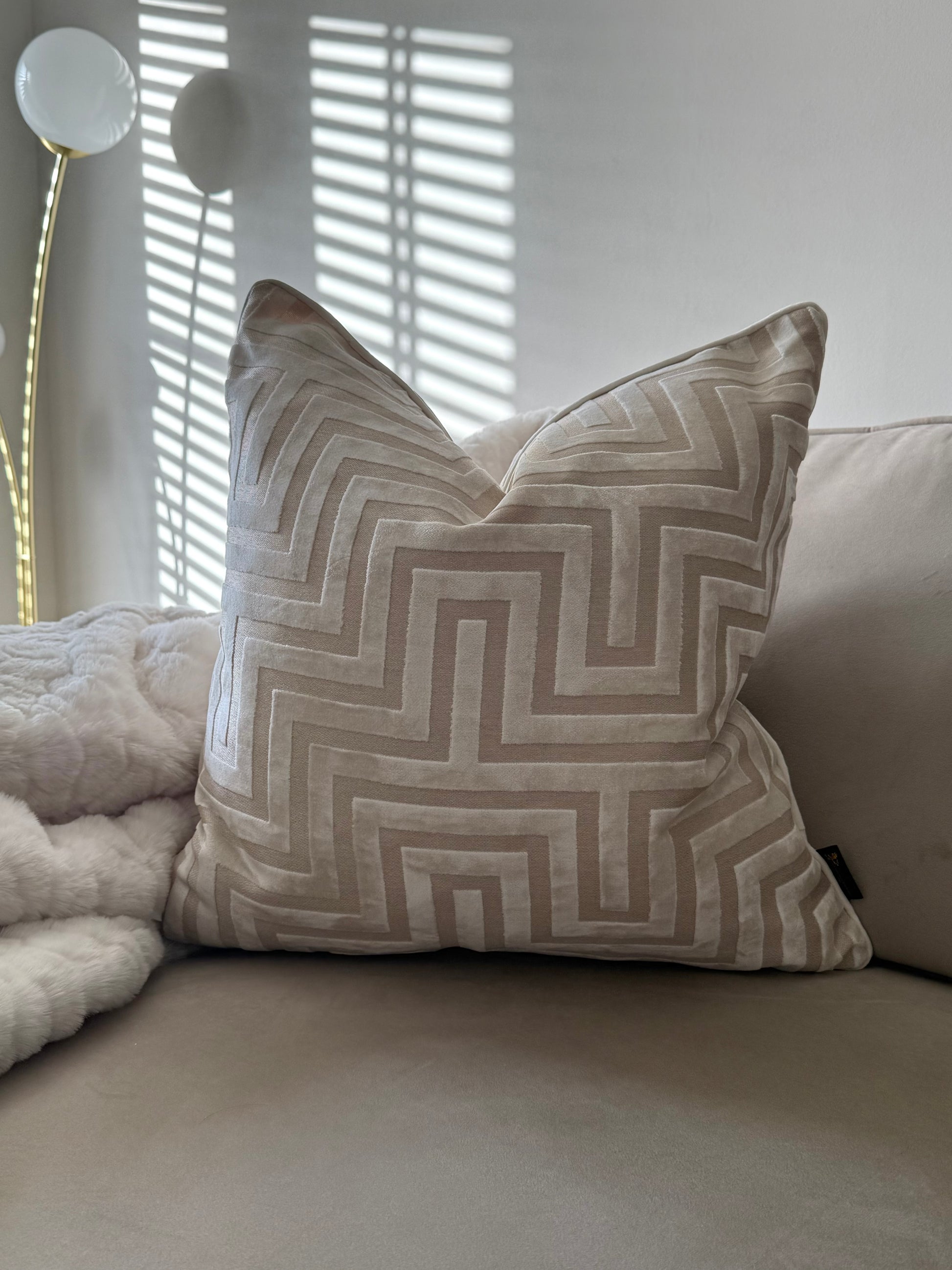 Introducing the Amazing ivory cushion. Featuring a one-of-a-kind maze cut velvet design by renowned interior designer Paul Moneypenny, this cushion exudes style and sophistication, elevating any room it graces. Make a statement with this stunning black cushion.
