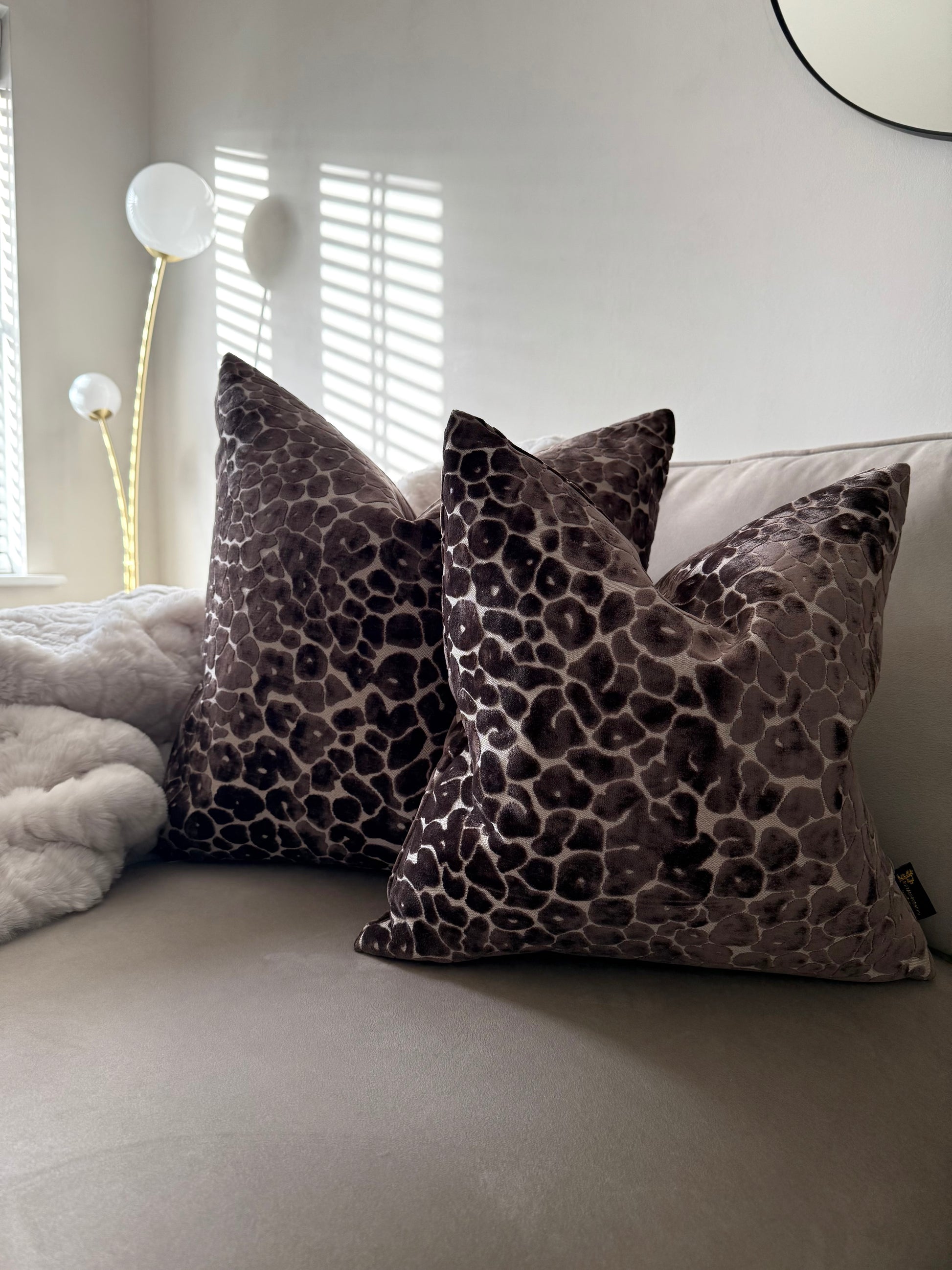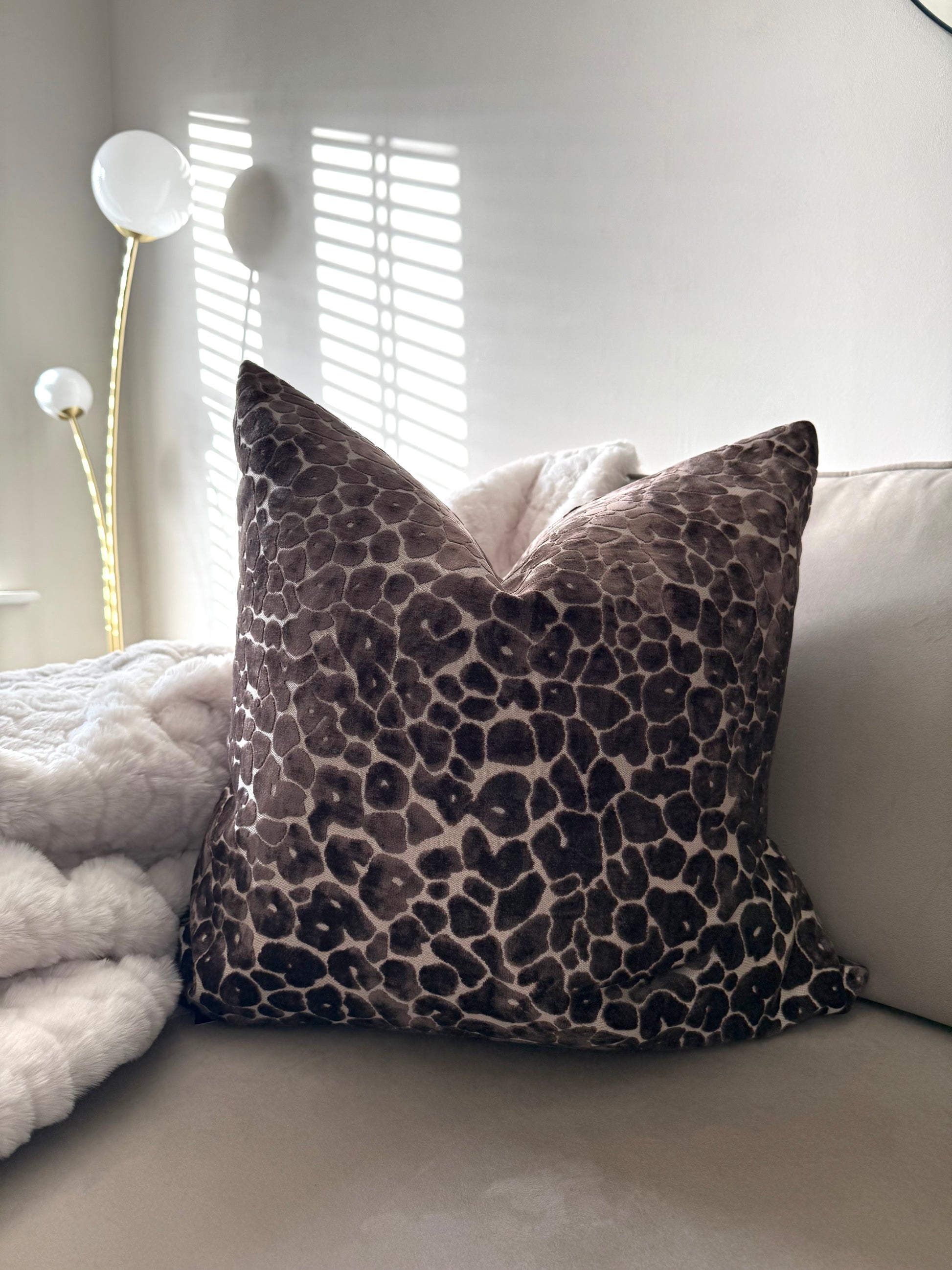 Introducing the Spot On chocolate large cushion, designed by renowned designer Paul Moneypenny. With a striking leopard print inspired design in a luxurious velvet finish, this cushion adds a touch of luxury to any room. Crafted with expert precision, it boasts a 22" size for ultimate comfort and style. Elevate your space with the perfect on trend, rich chocolate toned statement piece.