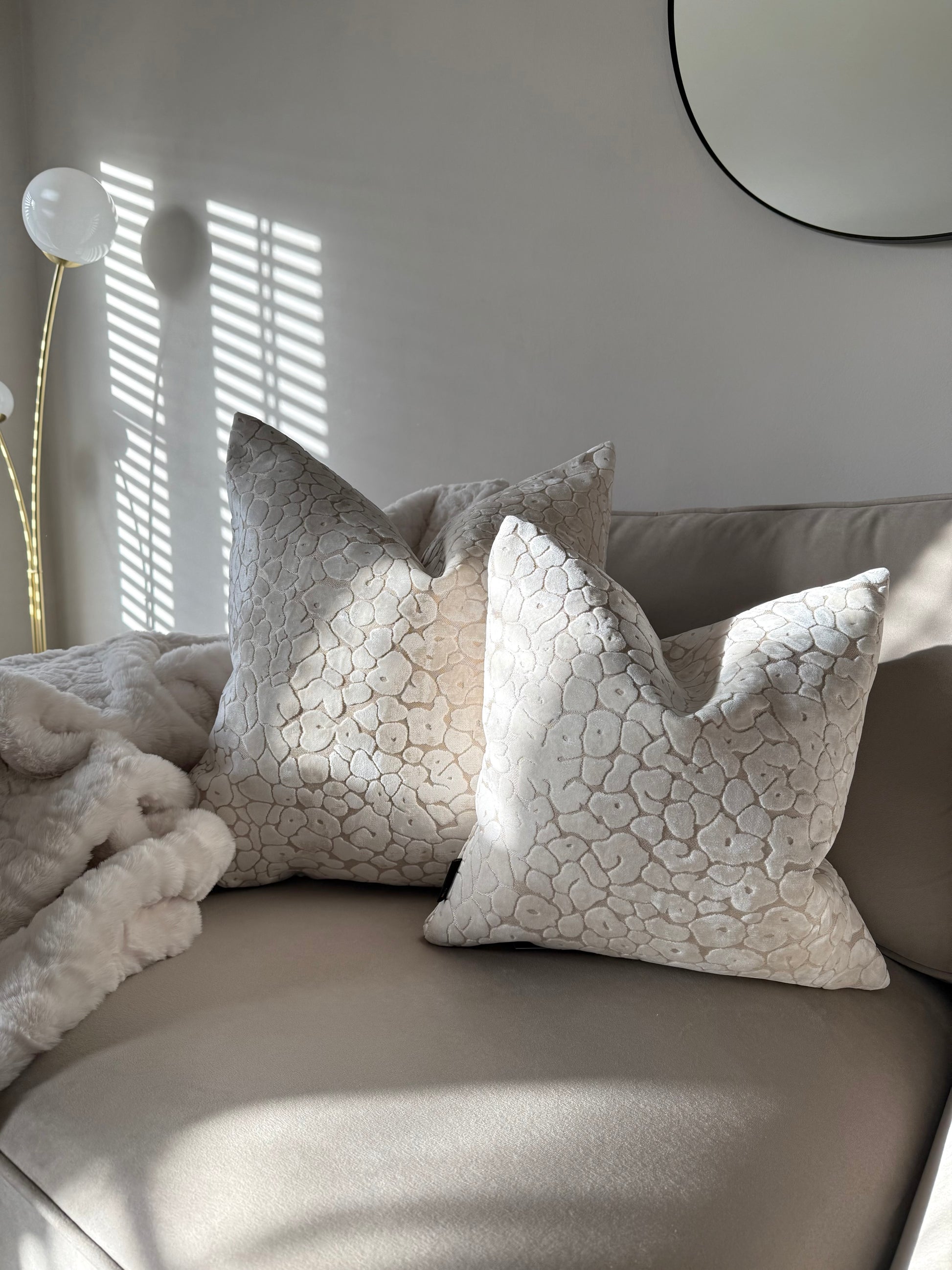 Introducing the Spot On ivory large cushion, designed by renowned designer Paul Moneypenny. With a striking leopard print inspired design in a luxurious velvet finish, this cushion adds a touch of luxury to any room. Crafted with expert precision, it boasts a 22" size for ultimate comfort and style. Elevate your space with the perfect on trend, neutral toned statement piece.