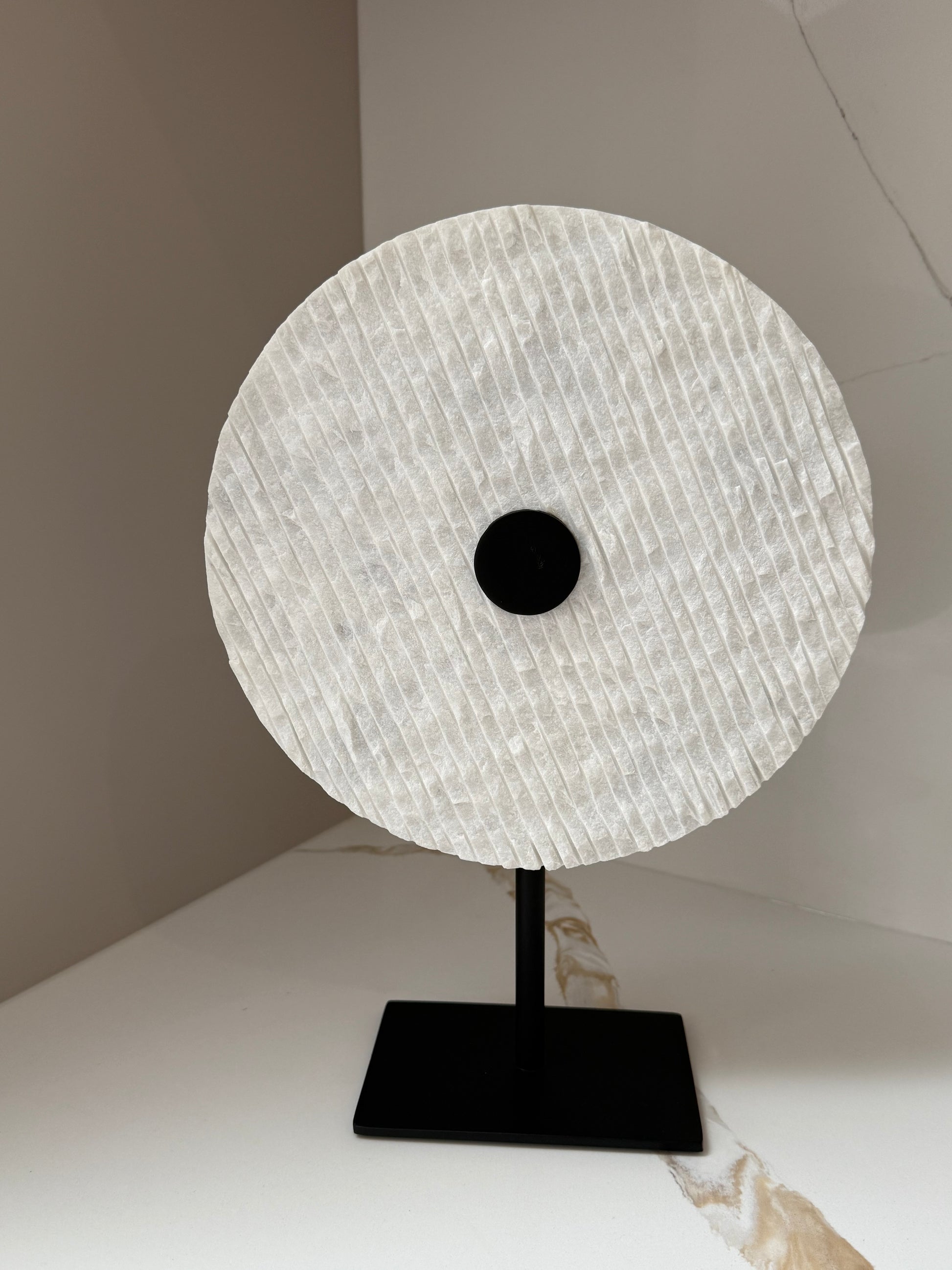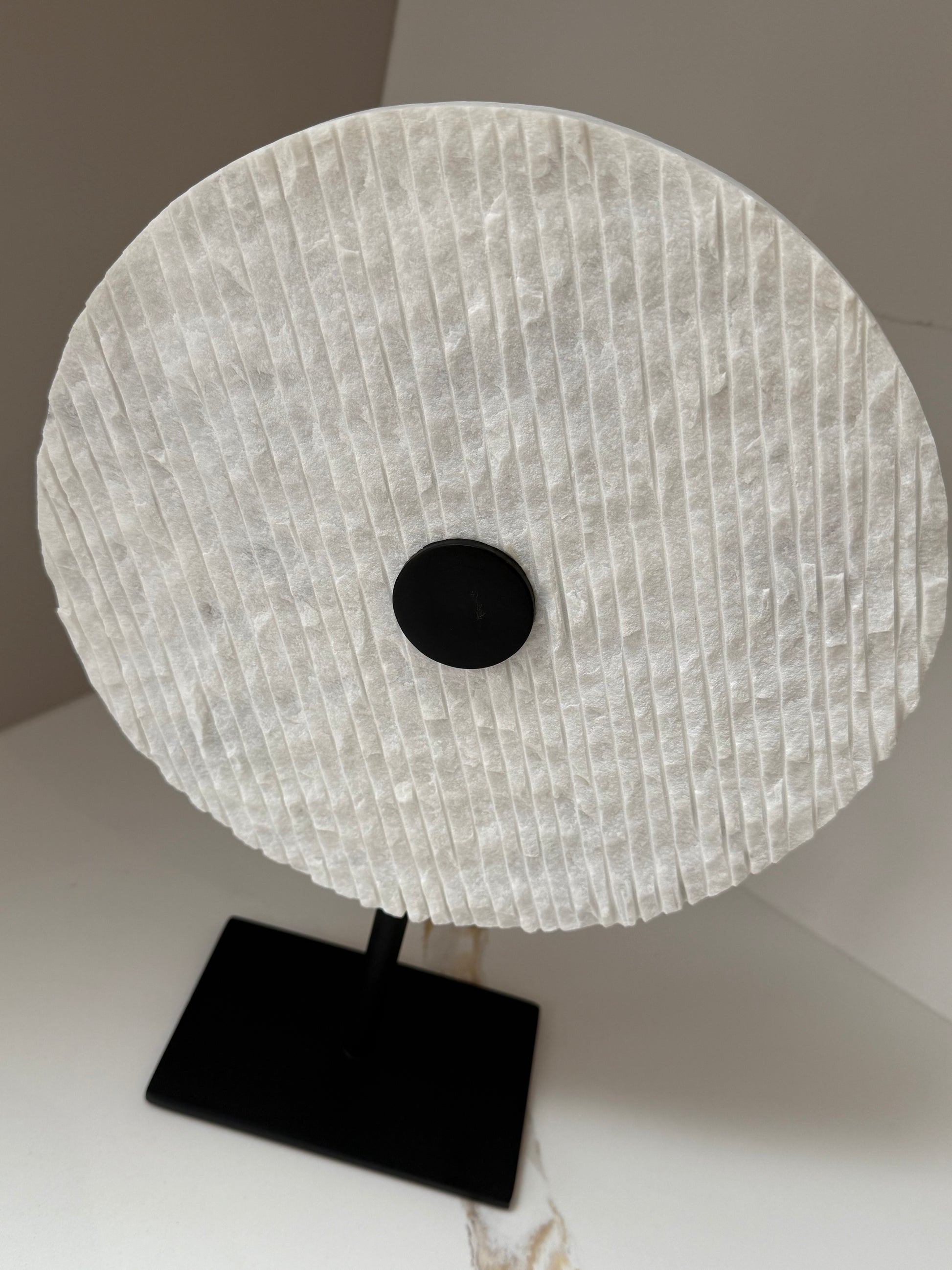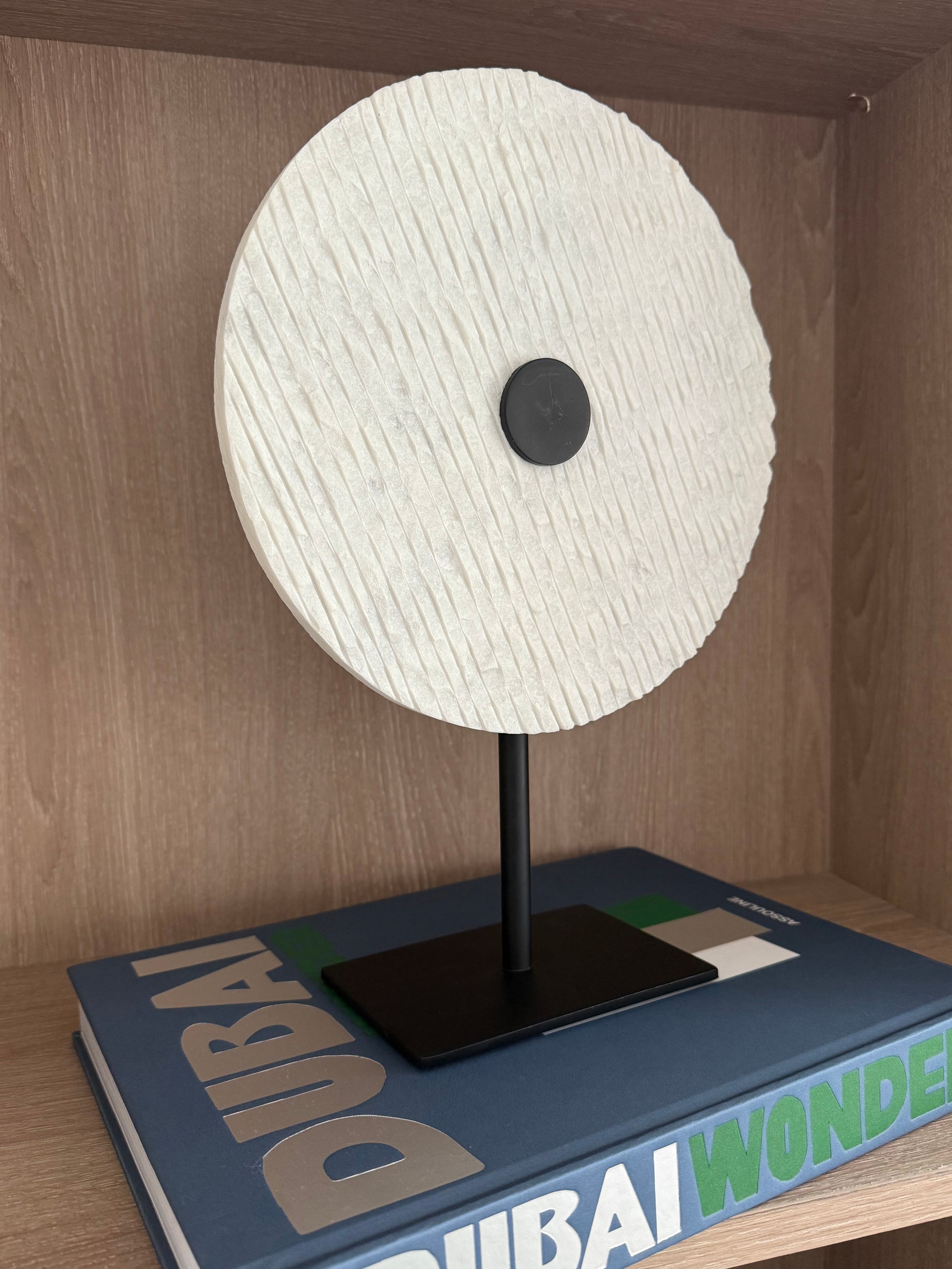 The YFKE White Marble and Black Sculpture is a refined decorative piece that blends natural stone with bold contrast. Crafted from white marble with a textured circular design, it is finished with a matte black center detail and base for a striking modern look. Measuring 25 x 10 x 35 cm, this sculpture stands as a statement ornament, perfect for styling on consoles, sideboards, or shelves. Its combination of timeless marble and contemporary black accents makes it a versatile piece that suits both modern and classic interiors.