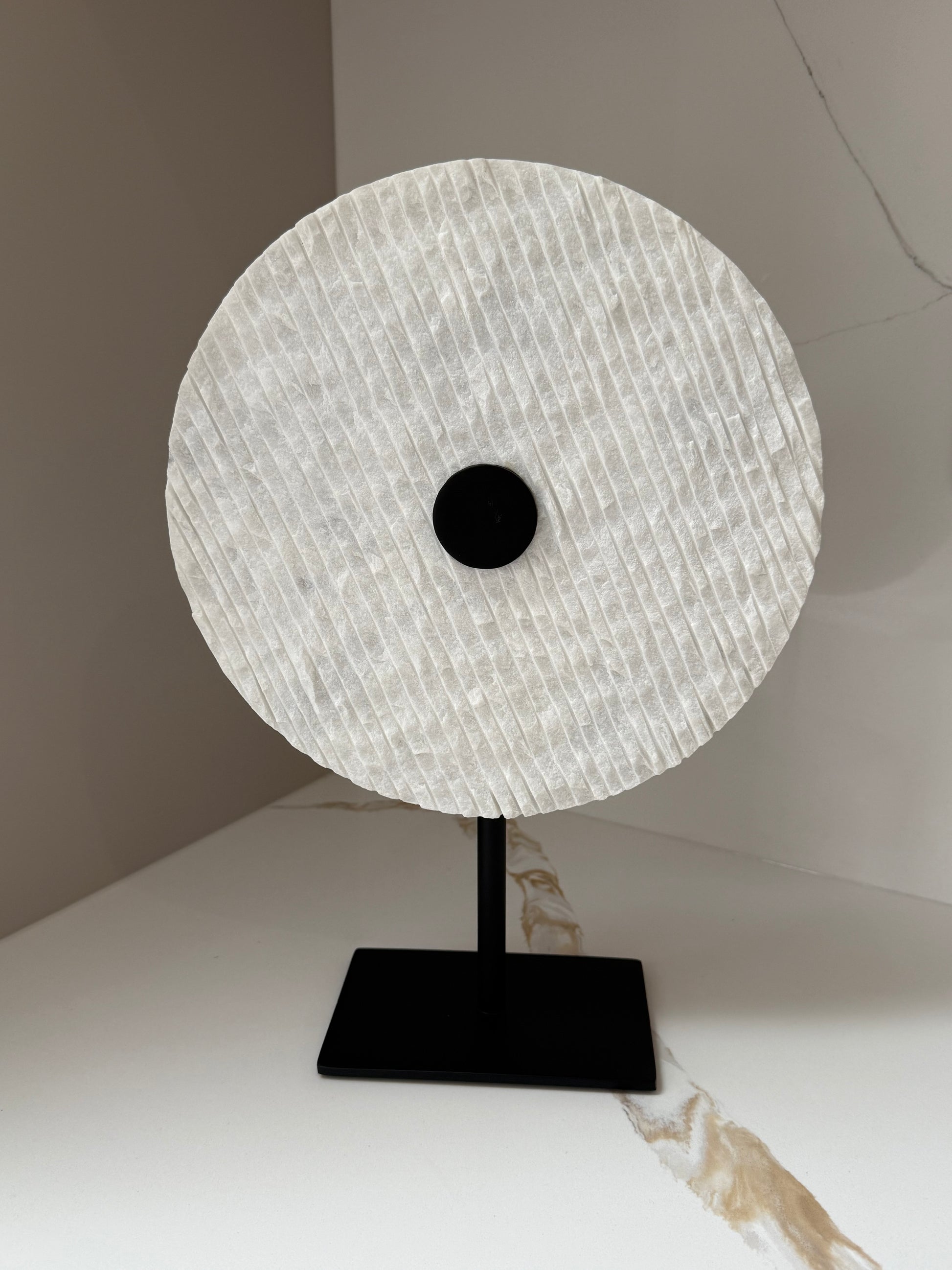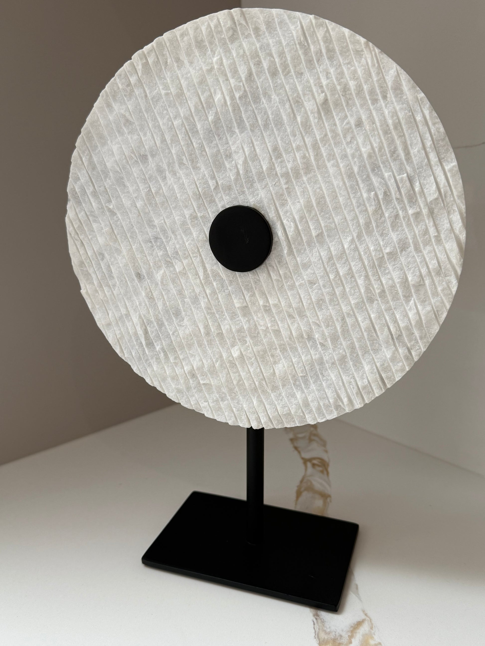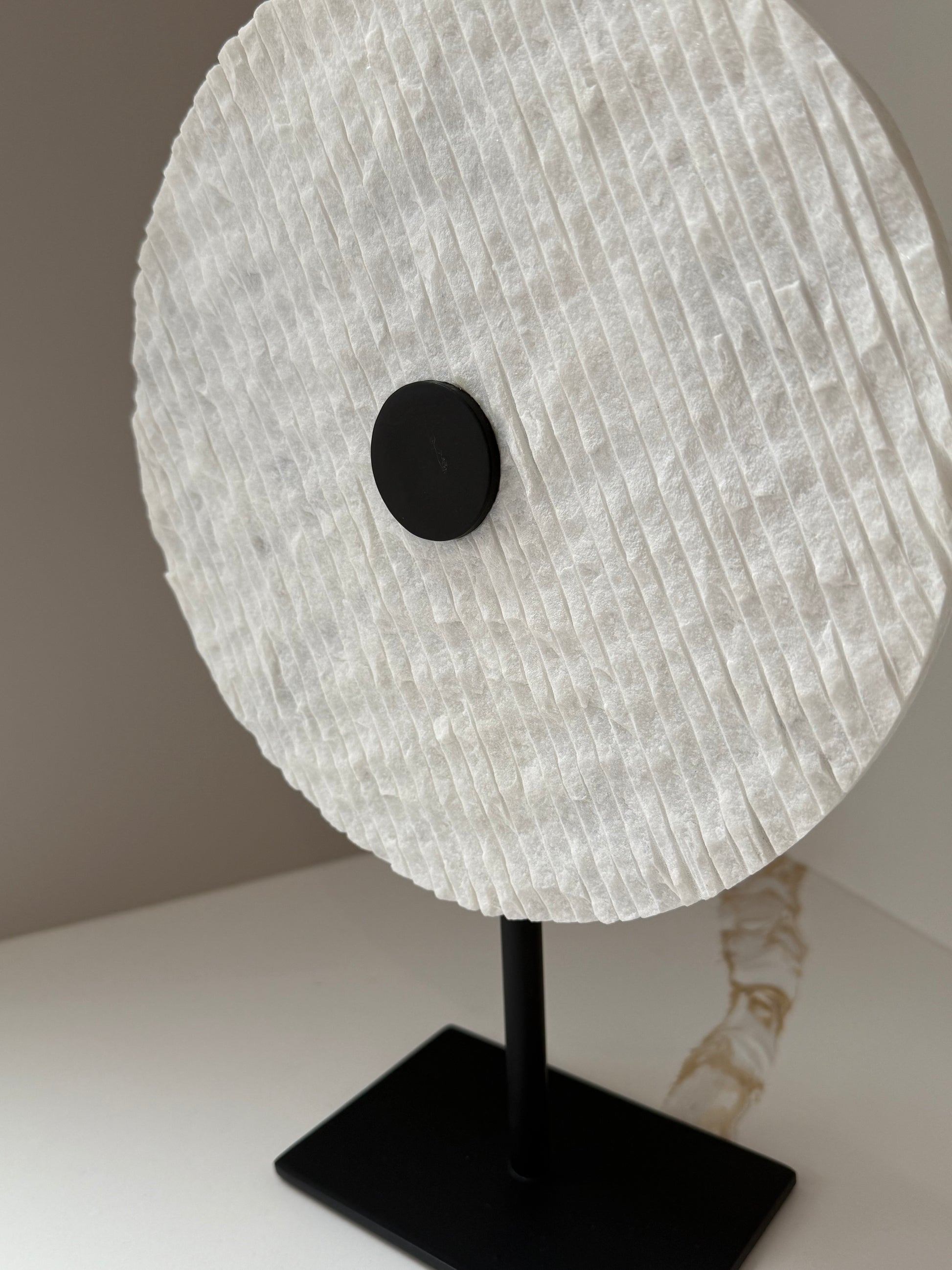 The YFKE White Marble and Black Sculpture is a refined decorative piece that blends natural stone with bold contrast. Crafted from white marble with a textured circular design, it is finished with a matte black center detail and base for a striking modern look. Measuring 25 x 10 x 35 cm, this sculpture stands as a statement ornament, perfect for styling on consoles, sideboards, or shelves. Its combination of timeless marble and contemporary black accents makes it a versatile piece that suits both modern and classic interiors.