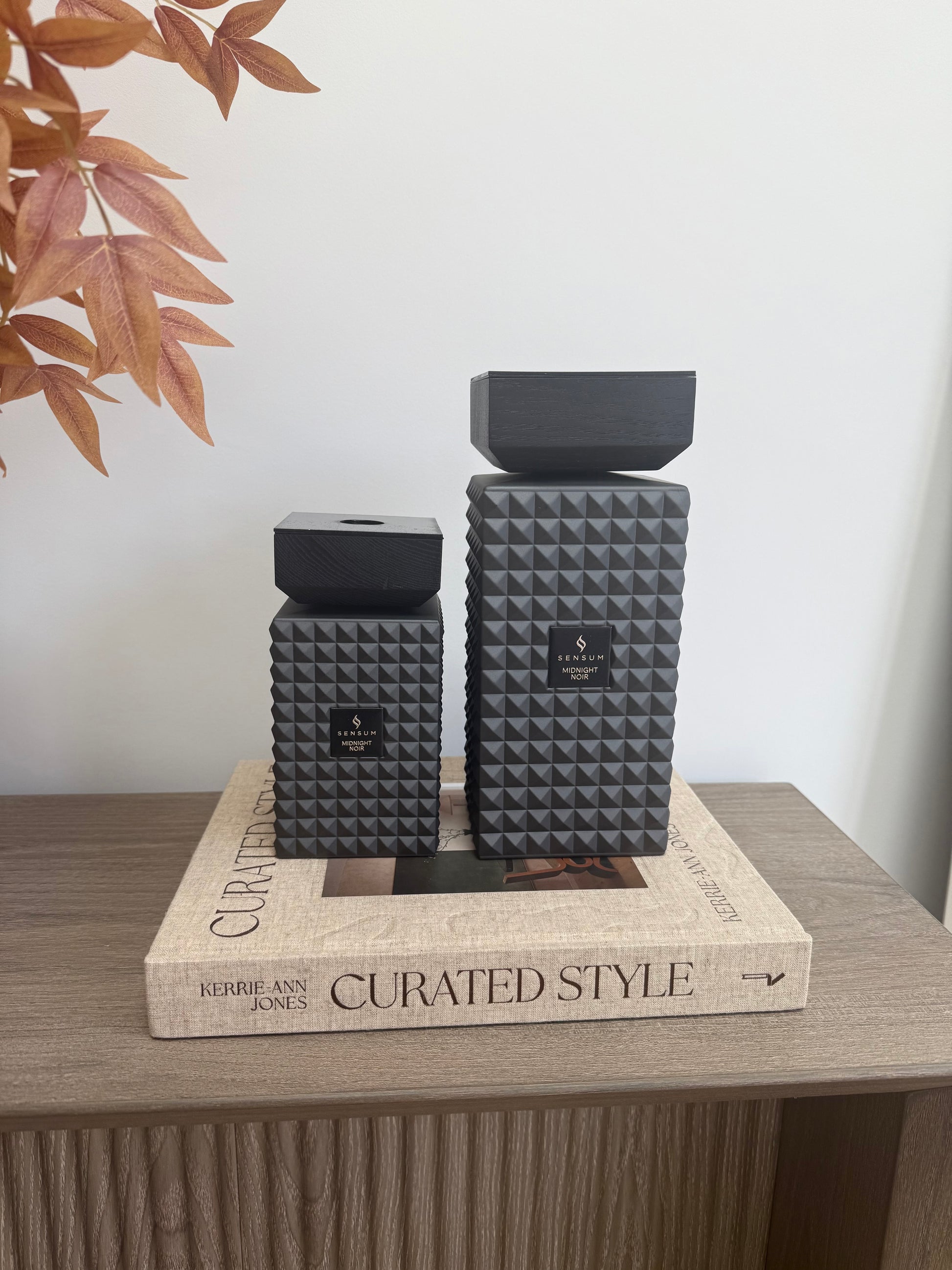 Midnight Noir is a bold and captivating reed diffuser that brings a refined, mysterious ambiance to your home. Encased in a striking matte black studded vessel with a sleek wooden cap, this diffuser is designed to make a statement, both in style and in scent.